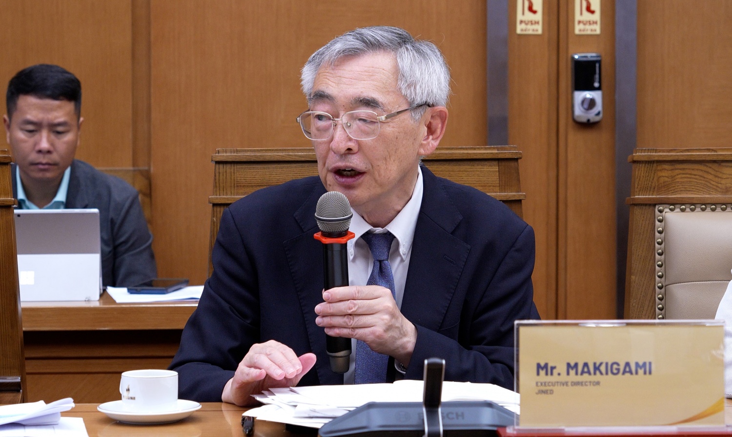 Ông Makigami Takeshi - Giám đốc Điều hành, Trưởng đại diện JINED tại Việt Nam chia sẻ một số nội dung trọng tâm về quản trị dự án điện hạt nhân.