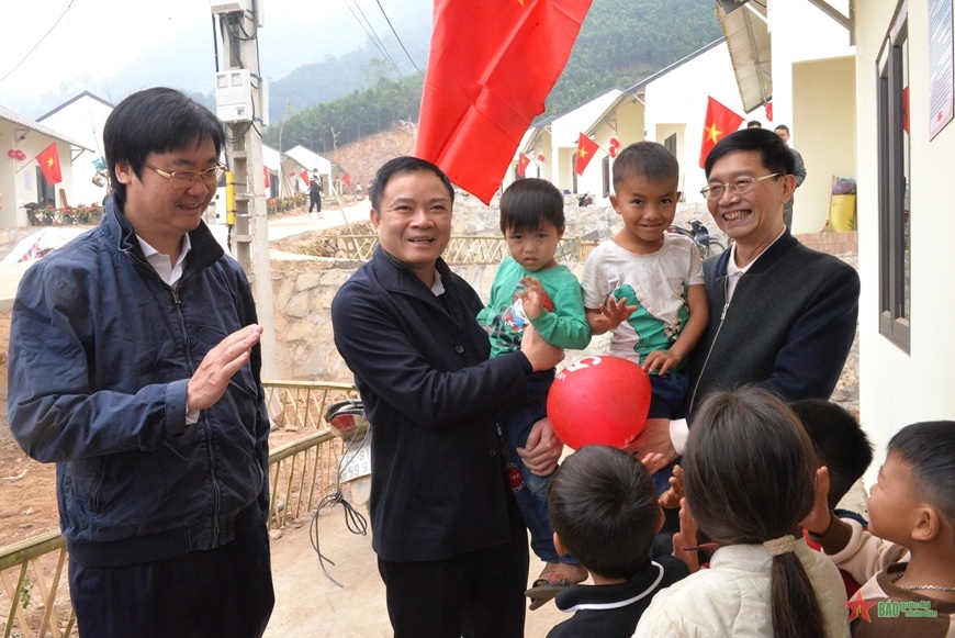 Tổng Giám đốc Petrovietnam Lê Ngọc Sơn; Phó Bí thư thường trực Đảng ủy Petrovietnam Trần Quang Dũng; Chủ tịch Công đoàn Petrovietnam Nguyễn Mạnh Kha và trẻ em thôn Kho Vàng
