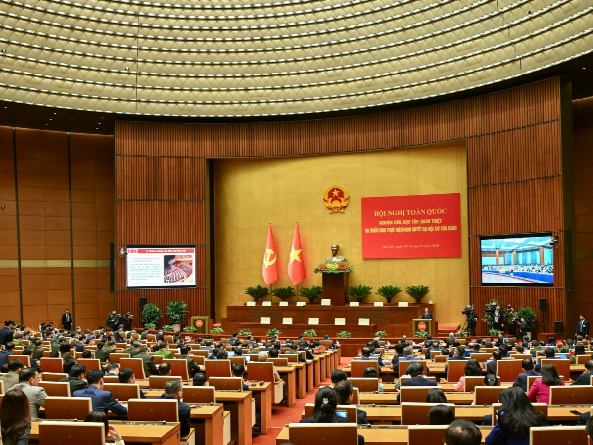 Ngày 7/2, Hội nghị toàn quốc nghiên cứu, học tập, quán triệt và triển khai thực hiện Nghị quyết Đại hội XIV của Đảng được tổ chức theo hình thức trực tiếp từ điểm cầu chính tại phòng họp Diên Hồng, Nhà Quốc hội kết nối trực tuyến tới điểm cầu các ban, bộ ngành, địa phương, các cơ quan.