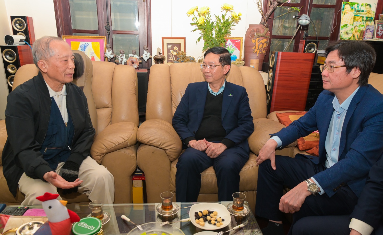 Đồng chí Lê Xuân Huyên - Phó Tổng Giám đốc phụ trách Ban Điều hành Petrovietnam cùng đồng chí Nguyễn Mạnh Kha, Chủ tịch Công đoàn Petrovietnam, trò chuyện với đồng chí Phan Đình Đức, nguyên Thành viên HĐTV Petrovietnam (con trai Thượng tướng Đinh Đức Thiện).