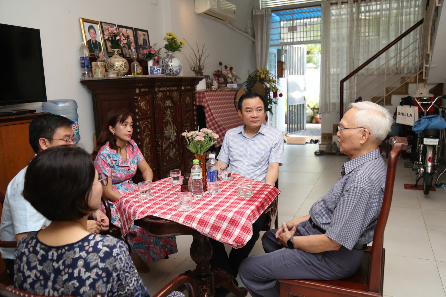 Đồng chí Lê Xuân Huyên - Phó Tổng Giám đốc phụ trách Ban Điều hành Petrovietnam cùng đồng chí Nguyễn Mạnh Kha, Chủ tịch Công đoàn Petrovietnam, trò chuyện với gia đình Trung tướng Nguyễn Hòa, cố Tổng cục trưởng Tổng cục Dầu khí.